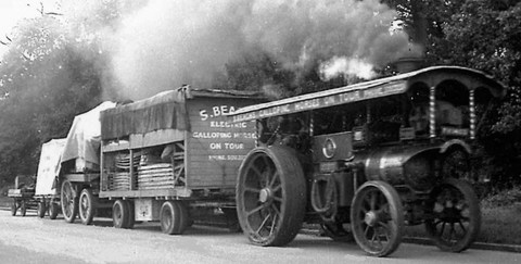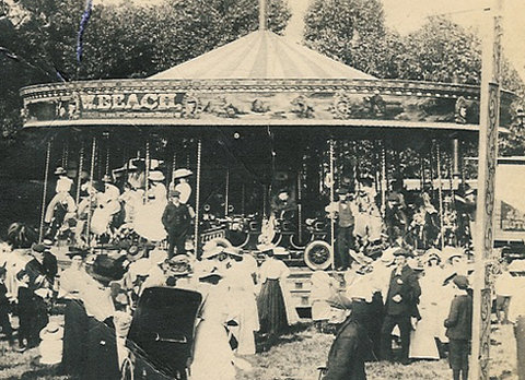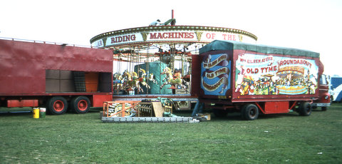 Finally the fair was built. Around the perimeter were coconut shies, tin cans and cricket balls, rifle shooting, darts, candyfloss and toffee apples. Beef burgers and hot dogs came a lot, lot later. The prizes were either more goes, or you could collect tokens towards the value of a higher prize. There were also bits of glassware and other pottery to be won. I loved the Plaster of Paris ornaments of Alsatian type dogs, or elegant ladies – no doubt made during the winter time – but they looked better than that to me. Then there were several smaller round shaped stalls eg hoopla where a wooden hoop was thrown over the prize you were after, including a bottle of whisky! The hoops went over the prizes easily enough BUT they also had to go over the wooden square block the prize was standing on. One corner not over, no prize. I seem to remember goldfish hoopla, your winning fish put into a jam jar to take home. The other was little yellow ducks with hooks on their heads, floating around the middle of the stall, I know this sounds daft but yes, they were on water. The stall man swooshed the water to make the ducks bobble about and swim. They were in a trough in the middle that went all round the stall. Between them and the side of the stall a man would walk round and round. In his hand would be half a dozen canes with rings on the end. 'Prize every time, prize every time' he called. He then waited patiently till you had managed to hook a duck. He turned it over and there was a number on the bottom. Your prize was according to the number. It was goldfish in the early days, but I think it became bags of sweets later. At 6d a go it could not have been much, even so, 6d was a lot of money then. The first ride at the road side of the field, was swing boats. Six of them brightly painted yellow and red. Up the little set of steps, one person each side of the boat. Some youths would go single and have a competition to see how high they could get. Sitting on the wooden seat you took the opposite rope that hung from a cross bar above. By pulling the rope you started to swing, helped by a friendly push from Fred. The harder you pulled the higher you went. If there was no queue your go lasted longer. Under each boat was a long flat piece of wood connected at the back to a bar running the full length of the swingboats' A-frame. Time up, Fred lifted this wood onto his forearms, and the boat caught the wood on its downward swing, gradually stopping the boat. Thinking about it now it took some strength to do it time after time, day after day. Fred held the wood up tight enough so the boat did not move, you then stood up, perhaps a little wobbly, and then stepped over the side of the boat and down the steps. There were three BIG rides: The Fast Cars – which actually came a little later – eight or ten cars holding four people, they whizzed around at a great speed going up and down an undulating track. Very tame nowadays but excruciatingly exciting in the 50s and 60s. The fun fair lads taking the money from you as you sat in the car, moving to the next and the next, then stepping off at the control box just before the ride gained speed. No seat belts or fallout bars then. Music, the latest pops blasting from the loud speakers on the control box. 'Stand well back,' 'keep your feet clear of the wheels, keep your feet clear of the wheels.' The ride took forever while you were waiting, over in a flash when it was your go. I remember it being 6d a go. Dad had given us half a crown each to spend; any more came out of your money box. Five goes, it took a lot of thought and time to spend. The Dodgems or Bumper Cars – little two-people sized cars with long upright tails touching the meshes in the roof, sparks and smells. 'No bumping, NO Bumping, keep moving please, keep moving please.' There was also some instruction as to which way to go, we all seemed to go clockwise. I did not care for them too much. Brother David loved them so I was a half willing, unwilling passenger. Someone would crash you, or two cars would crash, then you would stop. No amount of steering, wheel turning, pedal pumping (accelerator only) would make the car go. A fun fair lad would rush from the control box, separate you, and off you would go again, till the next bump. There would be music, lights and smells from the electric sparks. That was all you could hear – the other music just disappeared. No sooner were you out of the car someone else was trying to get in. The third ride was the most magical thing I have ever seen in my life – the Carousel. ‘Sally Beaches Galloping Horses’ the fascia of the roof declared. All horses, no other animals, no sleighs, no carts, just beautiful horses. Their mouths open, showing enormous even teeth, sculptured manes flowing, strong backs with either one saddle or two and flowing real horse-hair tails. Painted in wonderful colours and lots of gold squiggles, pictures, flags, and the horse’s name painted within a beautiful scroll, they were magnificent. Smaller one-seat horses were on the inside of the moving platform, medium horses in the middle, big fat two-seater horses on the outside. As a small child I was only allowed to ride the inside horses as these smaller horses did not go so fast as the others (they had less far to travel). You sat on a wooden painted saddle holding a huge brass twisted pole, too big for little hands. It was a matter of 'hang on, don't slip'. But as we went round, and on looking down, I was terrified because big tanks of water were just below me. It was water for the steam engine. Looking up – the roof was a striped tarpaulin – there were cranked bars on which each horse was fitted, they were at different heights/angles so each horse was at a different height as the roundabout moved. There were fancy shaped pictures of exotic animals hanging from the bars: they rocked backwards and forwards to the movement of the ride. The floor was red, along with the steps up on