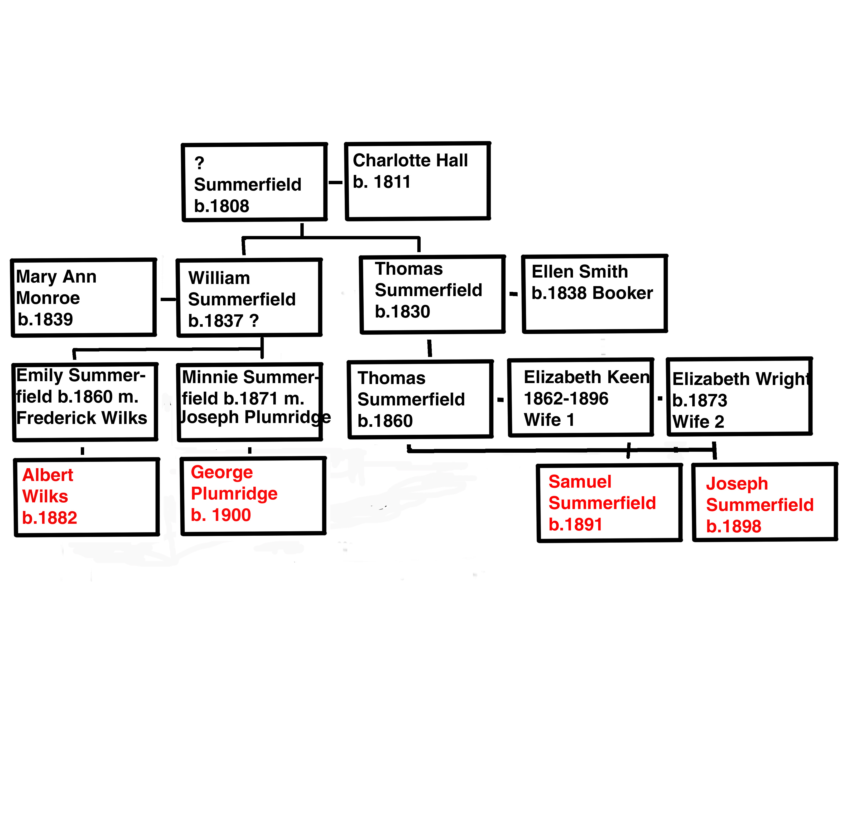Albert was the son of Frederick Wilks of Shipton, Oxon, and Emily Summerfield. Emily was a cousin of the father of Samuel and Joseph Summerfield. Albert's aunt Minnie