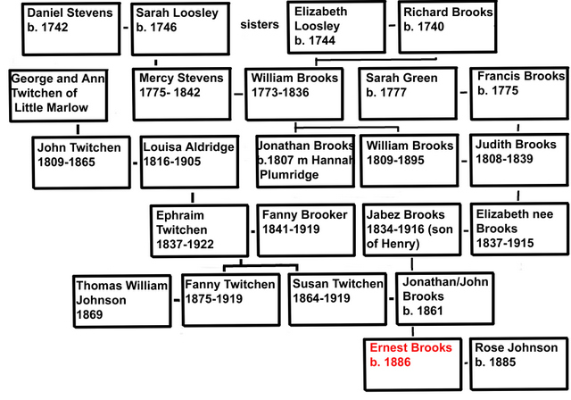 The Brooks have a complex tree with Brooks marrying Brooks. Plumridge, and possibly Smith and Rose, connections have yet to be researched so there is every chance that Ernest will be connected to other Flackwell Heath memorial names and perhaps to Percy Twitchen on the Little Marlow War Memorial since both these WW1 men have Little Marlow ancestors.