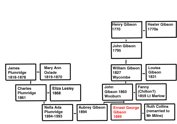 Gibsons abound in the area but I have been unable to make the necessary connections to link Ernest to these other Gibson families - most notably the Edward Gibson on the Loudwater memorial who also appears, like Ernest on the Wooburn Green memorial too. Ernest is also linked to the Chilton and Plumridge families but as yet I have been unable to confirm which ones. He married Ruth Collins who was the cousin of William J Collins on the war memorial. Please see his tree.