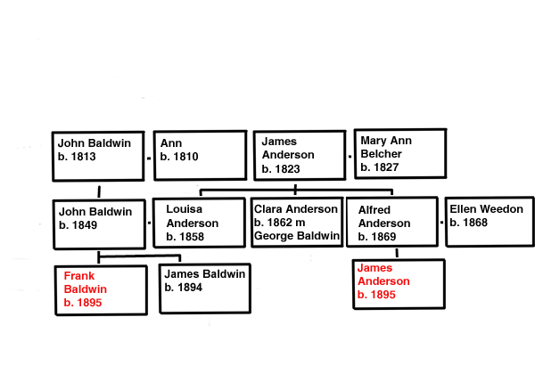 Frank Baldwin is related to James Anderson through his uncle, Alfred Anderson. As a result he will also be connected to the Weedon family. See relevant trees. It is not clear where the Baldwin family lived at this time but the Baldwin family of post war years lived in Sedgmoor Road. Baldwin descendants still live in the village today.