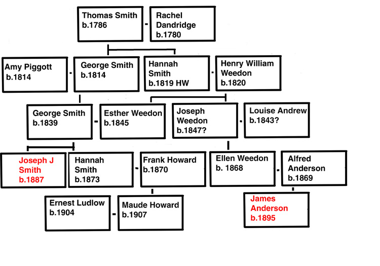 There were several Smith families in the village in the 1900s. No doubt many Smith boys and girls were related by this time but it is difficult to work out who was the descendant of who since many shared the same christian names eg George, Joseph, Arthur and Mary. Joseph's death is well documented however and so we are able to trace his ancestors to link them back to the Weedon family. Thus Joseph will be linked to George Weedon and, albeit distantly, to James Lewis. He is also be linked to James Anderson through another Weedon marriage and to William Redding via the Fassnidge family.