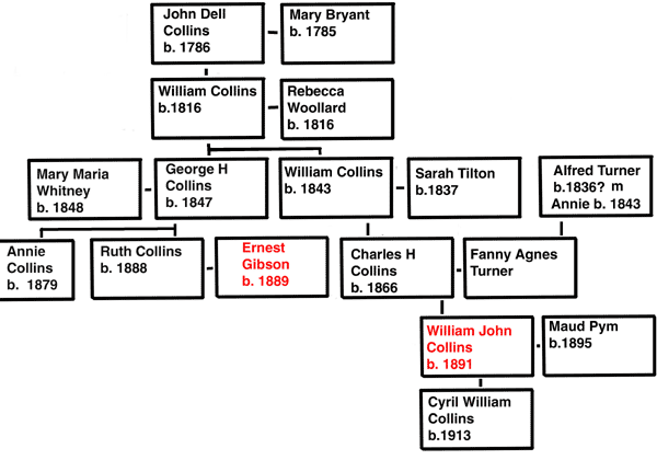 William's cousin, once removed, Ruth Collns, married Ernest Gibson. Ruth's sister Annie is connected to William Redding's family.