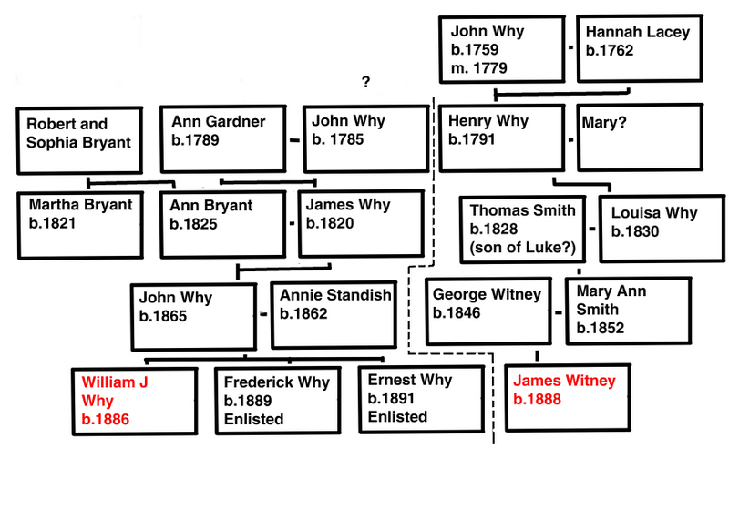 William is linked to the Bryant family, a familiar surname in this area. As a result he could be related, albeit distantly, to some of our other war memorial men. Certainly Martha Bryant was the grandmother of Thomas Durrant. He could also be related to James Witney (and in turn to Alfred Bowler) through the Why line as James's grandmother would appear to be a Louisa Why. Could James and William's great grandfathers be brothers perhaps? Only time will tell.